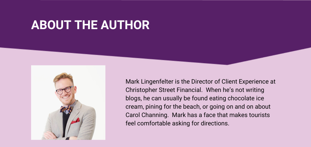 And, I have the honor of doing that at Christopher Street Financial, the nation’s first financial planning firm dedicated to serving the LGBTQ+ community and those that share with our values. And while, “gay” may still not be my preferred leading adjective for self-description, (I am funny, darnnit!) I recognize the gravity of the work we do in service to our clients and our community. And, I am happy that in times I like these, that I get to do that all here.
